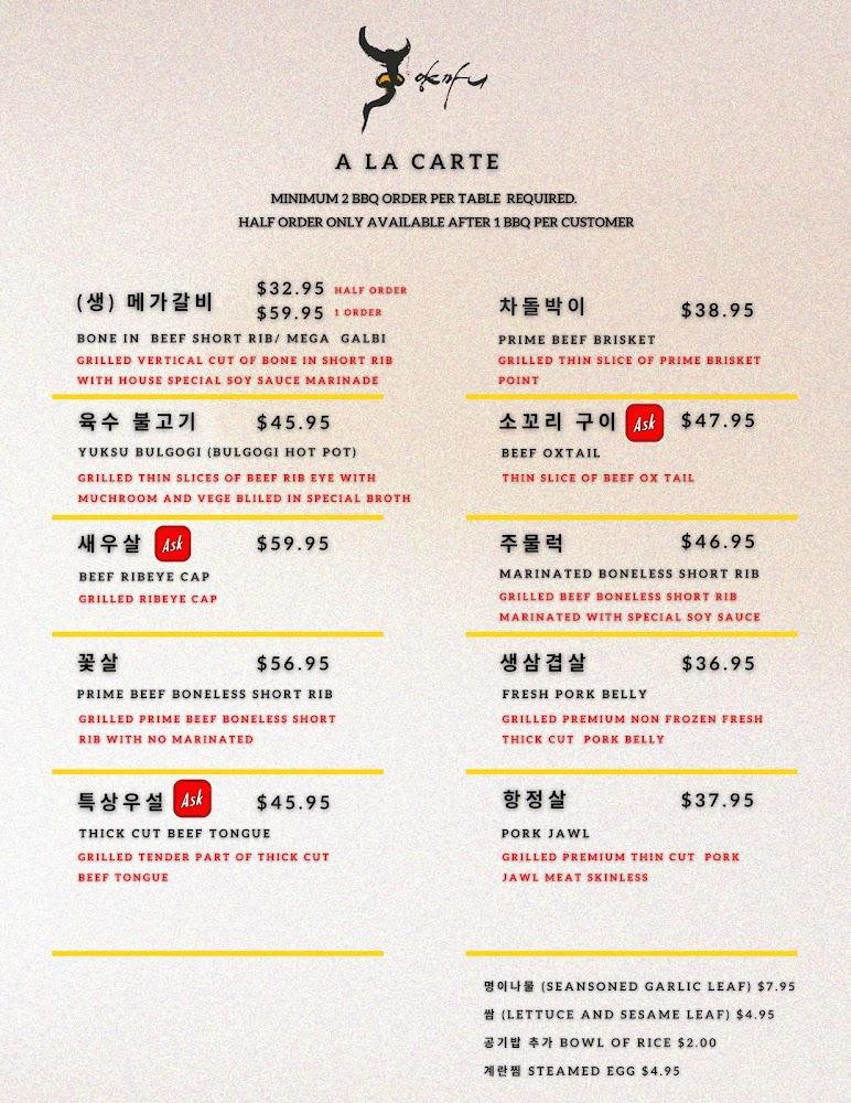 In total, the menu boasts over 75 options, including diverse meats and beverage selections. The restaurant serves alcoholic drinks like soju and Korean beer, pairing well with grilled dishes. Unique offerings such as beef tartar and brisket soybean paste stew ensure a delightful experience for every palate.