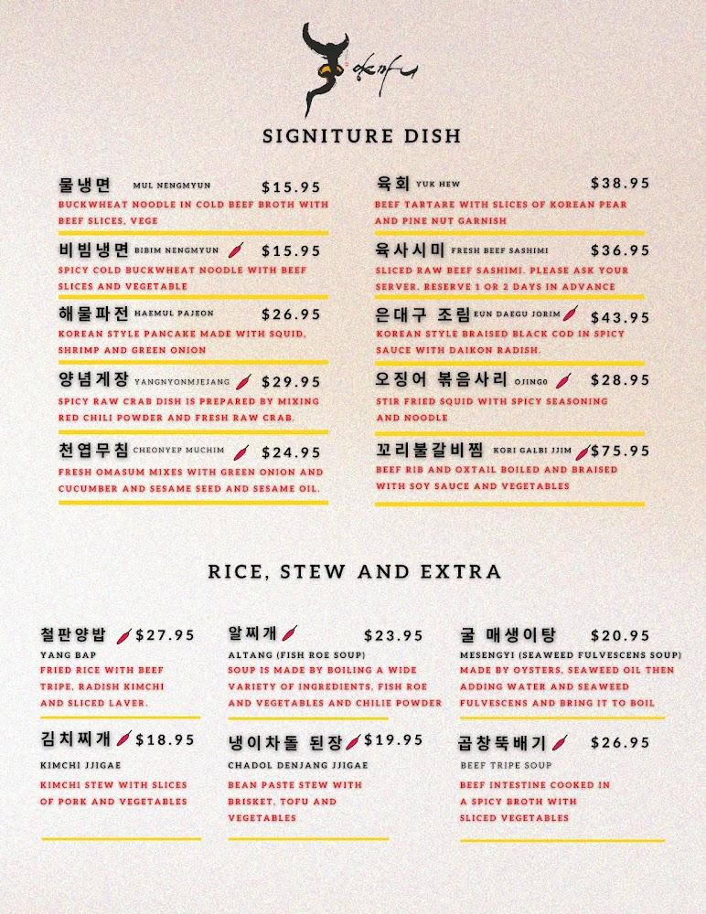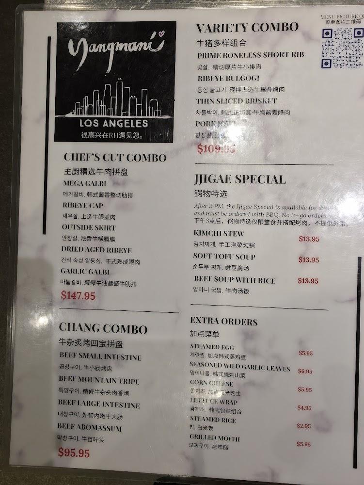 Yangmani's menu is a vibrant showcase of Korean BBQ offerings. Guests can delight in the Chef's Cut Combo, featuring prime short ribs and ribeye. Each dish is expertly seasoned, enhancing the natural flavors of the meats. Sides like kimchi stew and soft tofu soup complement the main dishes beautifully.
